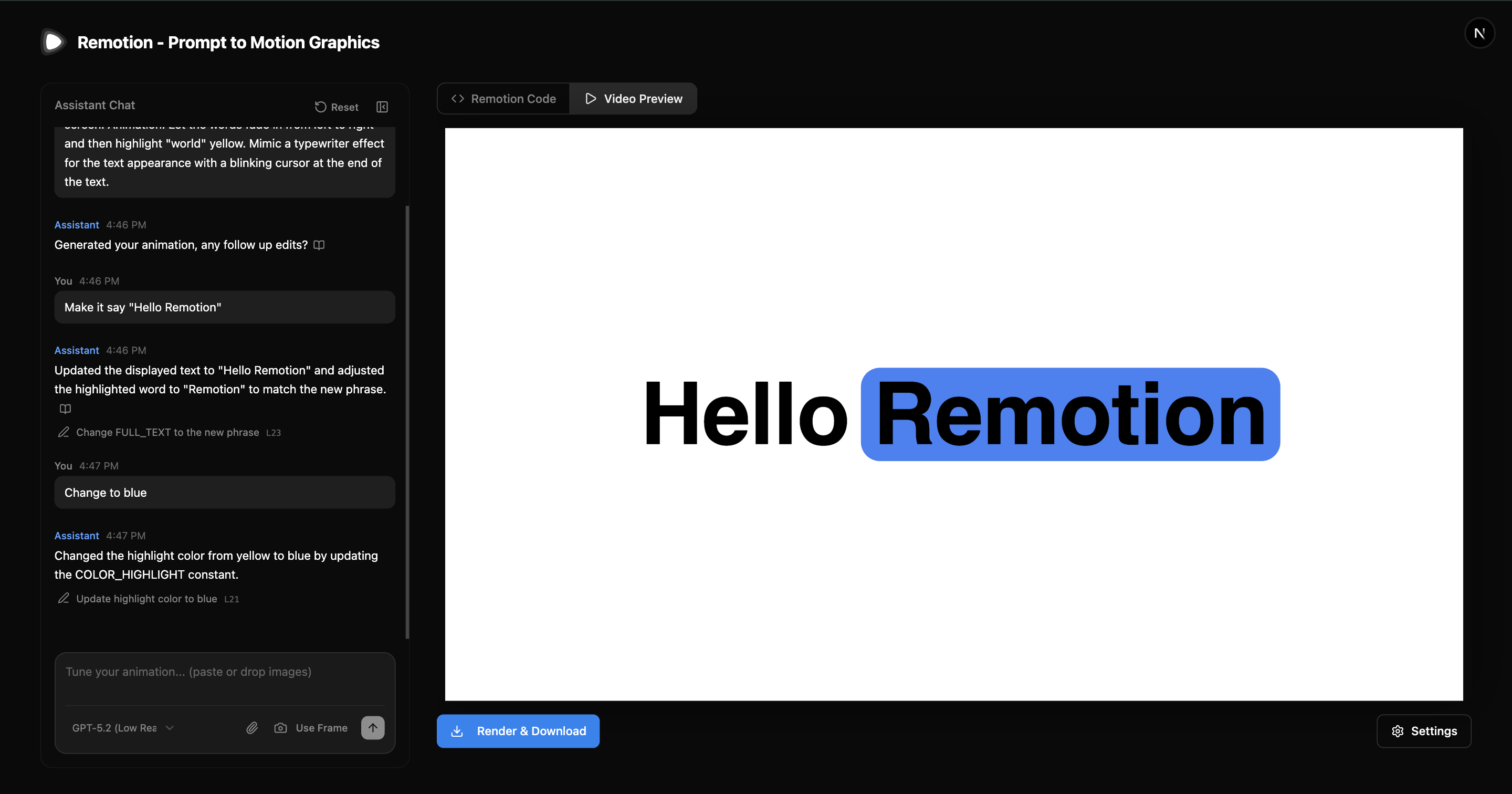 A SaaS template for "Prompt to Motion Graphics" products. Generates Remotion code, streams it to the frontend, and compiles and previews it in the browser. See the